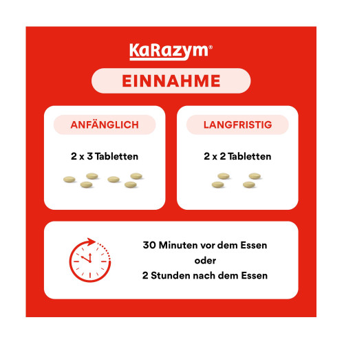 KaRazym® Tabletten sind mit einem magensaftresistenten Überzug versehen, um die Enzyme und deren Aktivität vor dem Angriff der Magensäure zu schützen. Die Tabletten werden im Dünndarm aufgelöst und die Enzyme freigesetzt.