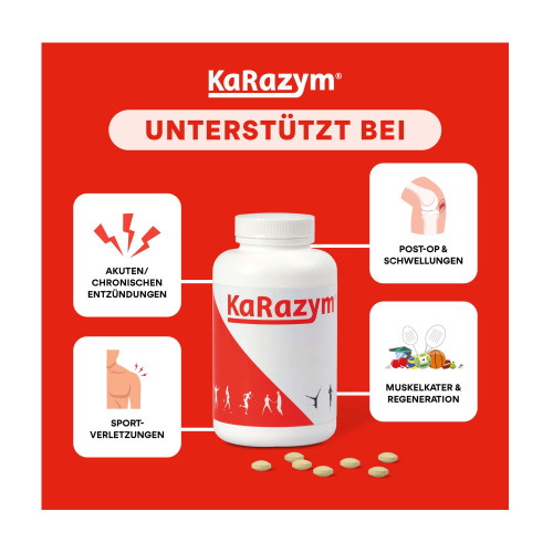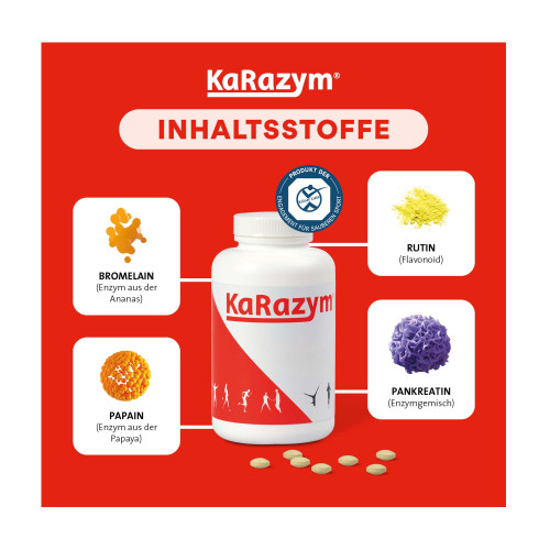 Bei den in KaRazym® enthaltenen Enzymen handelt es sich um eiweißspaltende Enzyme (Proteasen) aus Pflanzen (Papayas, Ananas) und Tieren (Schweinen).