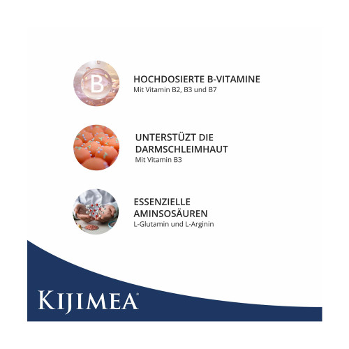 Kijimea® Mucosa enthält die Vitamine B2 (Riboflavin), B3 (Niacin) und B7 (Biotin), welche zur Erhaltung normaler Schleimhäute beitragen, in einer besonders hohen Dosierung. Darüber hinaus enthält Kijimea® Mucosa die essenziellen Aminosäuren L-Glutamin und L-Arginin.