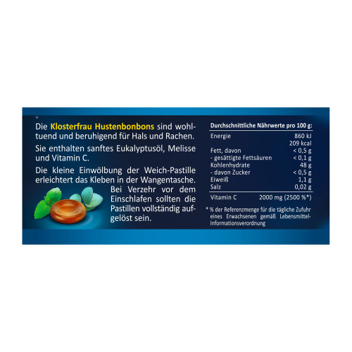 Die Klosterfrau Hustenbonbons sind wohltuend und beruhigend für Hals & Rachen. Sie enthalten sanftes Eukalyptusöl, Melisse und Vitamin C. Speziell für die Nacht entwickelt.