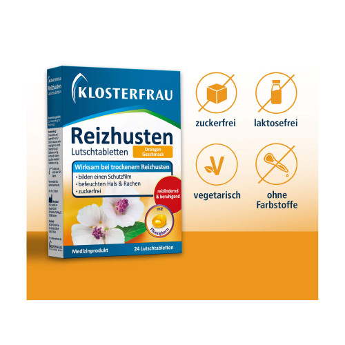Klosterfrau Reizhusten Lutschtabletten sorgen mit ihrem natürlichen Heilpflanzenkomplex auf Eibsich-Basis für eine wirksame Befeuchtung und den Schutz des Hals- und Rachenraumes. Durch die Schutzschicht auf den gereizten Schleimhäuten wird der Hustenreiz effektiv gelindert und die Atemwege werden beruhigt. Der fruchtig-leckere Orangengeschmack ist besonders angenehm.