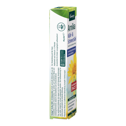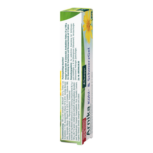 Kneipp Arnika Kühl- & SchmerzGel. Wirkstoff: Arnikablüten-Tinktur. Anwendungsgebiete: Gel zur Anwendung bei Erwachsenen und Heranwachsenden ab 12 Jahren. Zur äußerlichen Anwendung bei Verletzungs- und Unfallfolgen, z.B. bei Blutergüssen (Hämatomen), Verstauchungen (Distorsionen), Prellungen, Quetschungen. Warnhinweise: Enthält einen Duftstoff mit Benzylalkohol, Benzylbenzoat, Benzylsalicylat, Cinnamal, Cinnamylalkohol, Citral, Citronellol, Coumarin, Eugenol, Farnesol, Geraniol, Isoeugenol, Limonen und Linalool.
