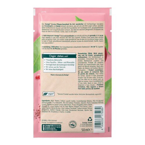 Das Kneipp® Aroma-Pflegeschaumbad Du bist wunderbar mit hochwertigen Extrakten aus Granatapfel und Kakao erinnert uns daran, was wir uns viel öfter sagen sollten. Genieße Deine wohlverdiente Auszeit und fühl Dich wunderbar mit fruchtigem Duft, granatapfelrotem Badewasser und langanhaltendem Schaum. Das Bad mit natürlich pflegendem Öl bewahrt die Haut vor dem Austrocknen. Schön, dass es Dich gibt!