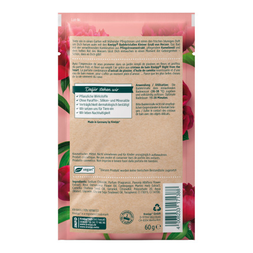 Trete ein in einen Garten voll blühender Pfingstrosen und nimm den frischen blumigen Duft um Dich herum wahr mit den Kneipp® Badekristallen Kleiner Gruß von Herzen. Das Bad mit der verwöhnenden Kombination aus Pfingstrosenextrakt, pflegendem Kamelienöl und dem hellen Rot des Wassers lässt Dich eintauchen in einen Moment der Geborgenheit – Schön, dass es Dich gibt!