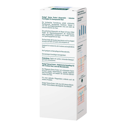 Die hochwertige Formulierung enthält schützendes Nachtkerzenöl, beruhigendes Panthenhol, Vitamin E und 10% feuchtigkeitsspendendes Urea und stärkt die natürliche Barriere der Haut. Die parfümfreie Körpermilch mit Repair & Protect Effekt fördert die Regenerationsprozesse der Hautbarriere, wirkt langanhaltend rückfettend und mindert Juckreiz und Spannungsgefühle der Haut. Die Haut bleibt 48 Stunden lang intensiv mit Feuchtigkeit versorgt und fühlt sich weich und entspannt an. Das aus den Samen gewonnene Nachtkerzenöl verfügt über einen außerordentlich hohen Gehalt an wertvoller Gamma-Linolensäure, die besonders zur Pflege und Versorgung der Haut von Neurodermitikern geeignet ist. Kneipp Derma Protect – Medizinische Hautpflege für sehr trockene Haut, auch bei Neurodermitis. Die Pflegeserie Derma Protect mit schützendem Nachtkerzenöl mindert Hautirritationen, spendet langanhaltend Feuchtigkeit und bewahrt die natürliche Barrierefunktion der Haut. Für ein optimales Pflegeerlebnis entdecke auch die anderen Produkte: Kneipp Derma Protect 10% Urea SOS Intensiv Balsam (PZN 19815319), Kneipp Derma Balance Beruhigender Duschbalsam (PZN 19829356).