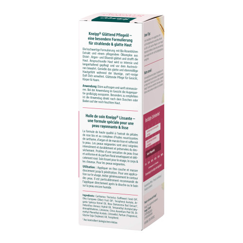 Die hochwertige Formulierung mit Bio Rosenblüten Extrakt und einem pflegendem Ölkomplex aus Distel-, Argan- und Olivenöl glättet und strafft die Haut. Anspruchsvolle Haut wird so intensiv und langanhaltend gepflegt und vor dem Austrocknen bewahrt. Genieße das glatte und ebenmäßige Hautgefühl während der blumige, zart-rosige Duft Dich verwöhnt. Glättende Pflege für Gesicht, Körper & Haare.