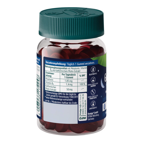 Glucosesirup, Zucker, Wasser, Verdickungsmittel: Pektin; Säuerungsmittel: Zitronensäure; Kalifornischer Mohnextrakt, Säureregulator: Natriumcitrat; Farbstoff: Anthocyane; natürliches Aroma, pflanzliches Öl (Kokosnuss), Pyridoxinhydrochlorid, Melatonin, Überzugsmittel: Carnaubawachs.