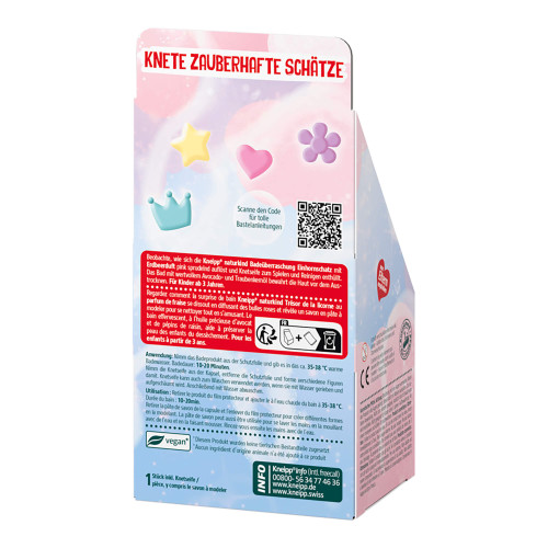 Beobachte, wie sich die Kneipp® naturkind Badeüberraschung Einhornschatz mit Erdbeerduft pink sprudelnd auflöst und Knetseife zum Spielen und Reinigen enthüllt. Das Bad mit wertvollem Avocado- und Traubenkernöl bewahrt die Haut vor dem Austrocknen.