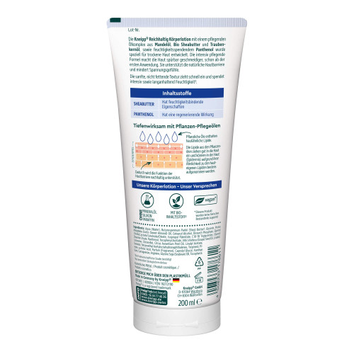 Die Kneipp Reichhaltig Körperlotion mit einem pflegenden Ölkomplex aus Mandelöl, Bio Sheabutter und Traubenkernöl, sowie feuchtigkeitsspendendem Panthenol wurde speziell für trockene Haut entwickelt. Die intensiv pflegende Formel macht die Haut spürbar geschmeidiger, schon ab der ersten Anwendung. Sie unterstützt die natürliche Hautbarriere und mindert Spannungsgefühle. Die sanfte, nicht fettende Textur zieht schnell ein und spendet intensiv sowie langanhaltend Feuchtigkeit.