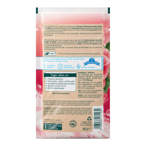 Nimm Dir Zeit für Dich und gönne Dir ein Bad mit den Kneipp® Schäumenden Badekristallen Verwöhnen. Natürliches ätherisches Öl der Damaszener Rose verwandelt das Badezimmer in eine Verwöhnoase und verzaubert die Sinne. Das Bad mit pflegendem Kamelienöl schützt die Haut vor dem Austrocknen.
