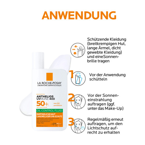 Das ANTHELIOS UVMUNE 400 Oil Control Fluid LSF 50+ täglich, aber insbesondere vor dem Sonnenbaden im Gesicht auftragen. Ölige Haut im Gesicht wird durch das Sonnenfluid mattiert und Hautglänzen gemildert. Bei längerem Aufenthalt in der Sonne sollte der Sonnenschutz alle zwei Stunden erneut aufgetragen werden. Die Sonnencreme ist wasserfest- und schweißresistent. Nach dem Baden oder Abtrocknen sollte der Schutz aber großflächig erneuert werden, um die Schutzfunktion aufrecht zu erhalten. Empfindliche Haut sollte zusätzlich zu einer Sonnencreme durch lange Kleidung und eine Kopfbedeckung vor der Sonne geschützt werden.