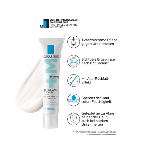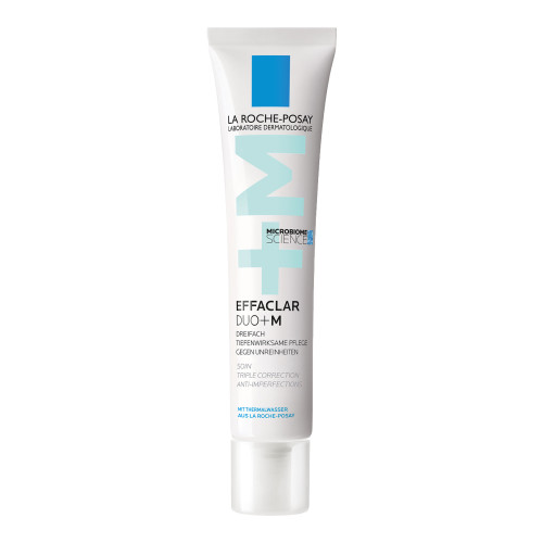 Die La Roche Posay EFFACLAR Duo+M wurde mit Hilfe der Mikrobiom-Wissenschaft entwickelt und wirkt effektiv gegen Pickel, Mitesser und andere Hautunreinheiten. Der Wirkstoff Phylobioma mildert die Überproduktion von Talg und glättet das Hautbild sowie korrigiert wissenschaftlich bestätigt Hautunreinheiten. Zusätzlich hilft Niacinamid dabei, das Erscheinungsbild dunkler Flecken und Pigmentierungen zu verblassen. Die Gesichtspflege für unreine, zu Akne neigende Haut mildert Pickel, Mitesser und Pickelmale bereits ab 8 Stunden sichtbar und spendet der Haut gleichzeitig intensive Feuchtigkeit. Dank der hochwirksamen Formulierung bietet EFFACLAR Duo+M einen Anti-Rückfall-Effekt.