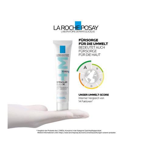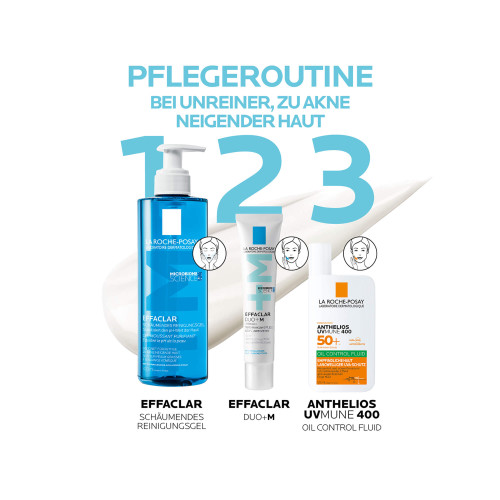 Für die vorherige Gesichtsreinigung eignet sich z. B. EFFACLAR Schäumendes Reinigungsgel (PZN 10779349) optimal. Eine haselnussgroße Menge der Gesichtscreme mit sanften, leicht streichenden Bewegungen auf Stirn und Gesicht einmassieren und die Augenpartie dabei aussparen. Danke der mattierenden, nicht fettenden Textur ist das EFFACLAR DUO+M auch optimal als Make-up-Grundlage geeignet.