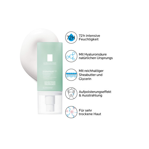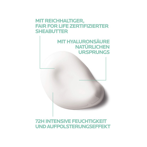 Mit Hyaluronsäure natürlichen Ursprungs, Sheabutter und Thermalwasser aus La Roche Posay wird die Haut intensiv mit Feuchtigkeit versorgt, aufgepolstert und geschmeidig gepflegt. Die reichhaltige Gesichtspflege wirkt Trockenheit entgegen und schenkt der Haut mehr Ausstrahlung. Die Haut bleibt bis zu 72 Stunden mit Feuchtigkeit versorgt und fühlt sich zart an.