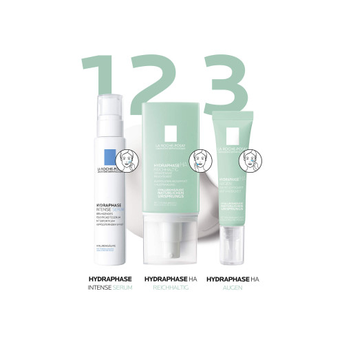 Verwenden Sie die La Roche Posay Hydraphase HA reichhaltige Gesichtspflege mit biofermentierte Hyaluronsäure morgens und abends. Geben Sie dafür eine kleine Menge der Creme auf Ihre Handfläche und verstreichen Sie die Textur mit leichten Bewegungen auf Ihrem Gesicht. Die reichhaltige Pflege spendet Ihrer Haut 72h Feuchtigkeit. Sparen Sie die Augenpartie aus und verwenden Sie für die zarte Haut um die Augen, die Augencreme Hydraphase HA Augen aus der Hydraphase Pflegeserie.