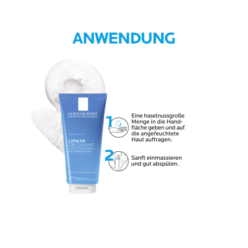 Eine haselnussgroße Menge LIPIKAR Gel Lavant auf die Handfläche geben. Auf die zuvor angefeuchtete Haut auftragen, sanft einmassieren. Abspülen.