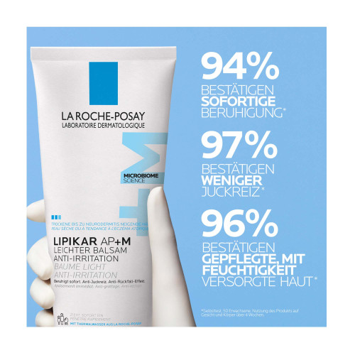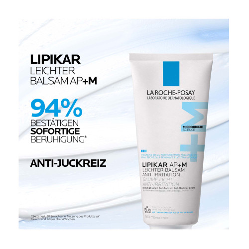Die La Roche Posay LIPIKAR Leichter Balsam AP+M Bodylotion für juckende, trockene und zu Neurodermitis neigende Haut einmal am Tag nach der Reinigung auf den Körper auftragen. Anschließend sanft in die Haut einmassieren. Die schnell einziehende Creme für juckende Haut zieht in weniger als einer Minute in die Haut ein und mildert die Anzeichen von Juckreiz, Trockenheit sowie Spannungsgefühle der Haut. Eine zusätzliche Pflege für trockene, zu Neurodermitis oder Allergien neigende Haut sind die rückfettende LIPIKAR Syndet AP+ Duschcreme, das LIPIKAR Dusch- und Badeöl AP+ und die LIPIKAR Eczema Med Akutpflege.
