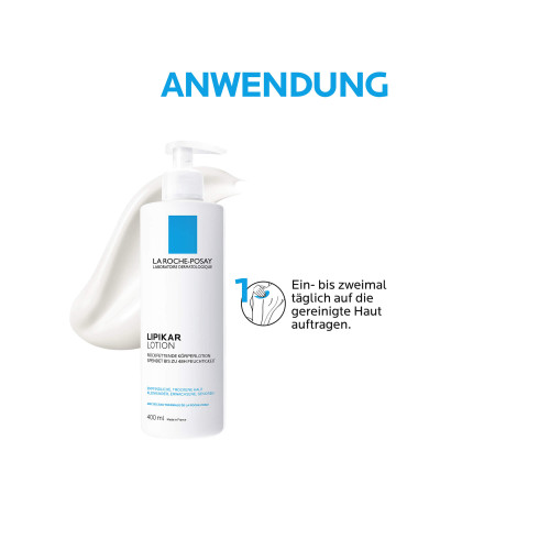 Die Lipikar Bodylotion von La Roche Posay einmal täglich oder je nach Bedarf auf den Körper oder punktuell auf besonders irritierte Hautstellen auftragen und sanft einmassieren. Die Hautpflege vorzugsweise auf die sanft gereinigte Haut auftragen, damit sie ihre volle Wirkung entfalten kann - beispielsweise in Kombination mit der Lipikar Surgras Duschcreme.