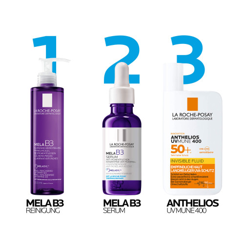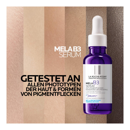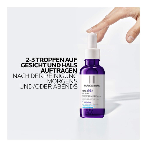 Das Anti-Pigmentflecken-Serum MELA B3 von La Roche Posay fängt überschüssiges Melanin ab, bevor dunkle Flecken auf der Haut überhaupt entstehen können. Dabei bewahrt und optimiert das patentierte Melasyl jeden natürlichen Hautton. Dank der multifunktionalen Formel des Gesichtsserums werden Pigmentflecken mit allen Hebeln bekämpft: Während Melasyl das Melanin reguliert und Niacinamid die Haut beruhigt, sorgt LHA für die Hauterneuerung. Hyaluron und Glycerin versorgen die Haut zusätzlich mit intensiver Feuchtigkeit. So ist bereits nach 4 Wochen eine erste Milderung von Pigmentflecken sichtbar.