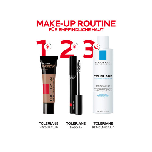 Als letzten Schritt der Pflegeroutine am Morgen eine kleine Menge des TOLERIANE Make-up Fluids mit den Fingerspitzen, einem Beauty-Schwämmchen oder einem Foundation-Pinsel von der Gesichtsmitte nach außen hin auftragen und die Übergänge sorgfältig verblenden. Stärkere Unebenheiten wie Augenringe oder Pigmentflecken können bei Bedarf mehrmals abgedeckt werden. Dabei ebenfalls darauf achten, dass keine auffälligen Übergänge entstehen. Bei Rötungen und Rosacea kann das Make-up mit der ROSALIAC AR Intensivpflege, bei Unreinheiten und Pickelmalen mit dem EFFACLAR Hochkonzentrierten Serum und bei Hautnebenwirkungen während und nach einer Krebstherapie mit dem CICAPLAST Baume B5+ kombiniert werden.