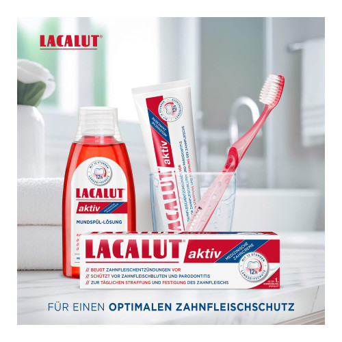 LACALUT aktiv Zahncreme zur Vorbeugung von Zahnfleischbluten und Parodontitis. Enthält die spezielle LACALUT aktiv Wirkstoffformel zur sofortigen, spürbaren Straffung und Festigung des Zahnfleischs. Beugt Zahnfleischentzündungen vor. Mit 12 Stunden Langzeitschutz zur Hemmung der Biofilmbildung.