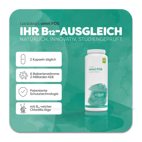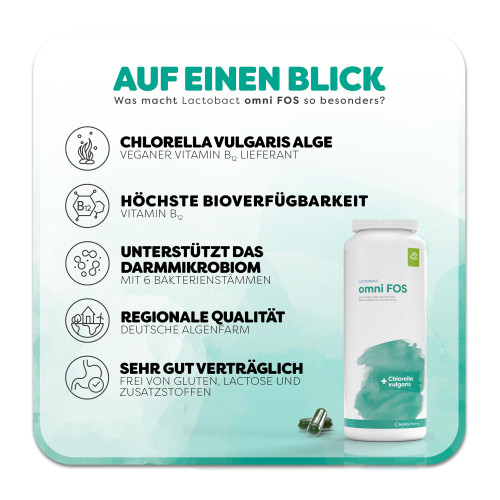 Lactobact omni FOS vereint in einer einzigen, magensaftresistenten Kapsel 6 wissenschaftlich ausgewählte, hochwertige biologisch aktive Bakterienstämme und die innovative Mikroalge Chlorella vulgaris, die besonders reich an Vitamin B12 ist. Diese einzigartige Kombination wurde speziell entwickelt, um sowohl Körper als auch Geist zu fördern.