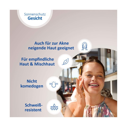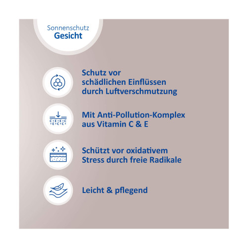 Dank ihrer leichten und pflegenden Rezeptur zieht die Sonnenschutz-Creme schnell ein und bietet eine ideale Grundlage für Make-Up. Sie schützt Ihre Haut effektiv vor sonnenbedingten Zellschäden und dank Anti-Pollution-Komplex aus Vitamin C & E vor oxidativem Stress und freien Radikalen. Die nicht komedogene Formel ist bei empfindlicher Haut, Mischhaut, sowie zu Akne neigender Haut gut geeignet. Die Creme legt sich sanft und unsichtbar auf die Haut, ohne Augenreizungen, Pilling-Effekte (Klumpen des Produktes auf der Haut) oder weiße Rückstände zu hinterlassen – so ist die Sonnenschutz-Creme der perfekte Begleiter im Alltag.