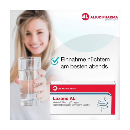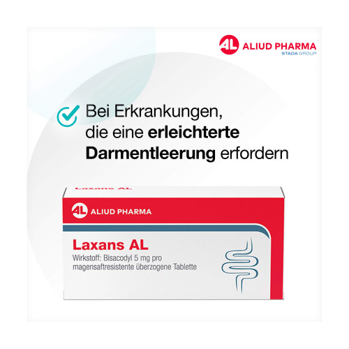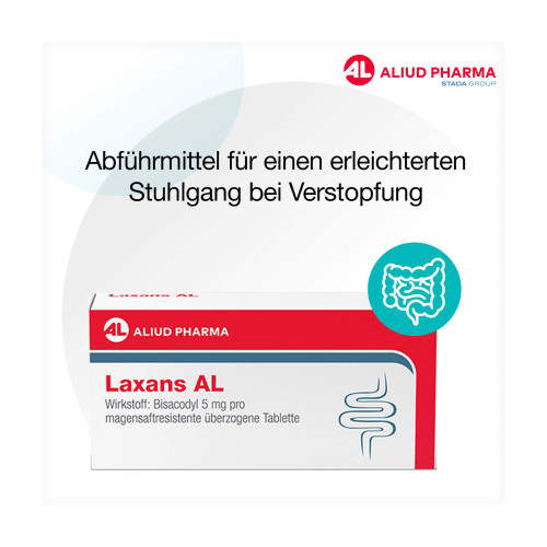 Laxans AL. Wirkstoff: Bisacodyl 5 mg pro magensaftresistente überzogene Tablette. Anwendungsgebiete: Zur Anwendung bei Erwachsenen und Kindern ab 2 Jahren. Zur kurzfristigen Anwendung bei Verstopfung sowie bei Erkrankungen, die einen erleichterten Stuhlgang erfordern. Warnhinweise: Enthält Glucose, Lactose und Saccharose.