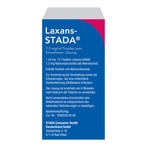 Laxans-Stada 7,5 mg/ml Tropfen zum Einnehmen, Lösung. Wirkstoff: Natriumpicosulfat. Anwendungsgebiete: Zur Anwendung bei Erwachsenen und Kindern ab 4 Jahren. Zur Anwendung bei Verstopfung sowie bei Erkrankungen, die eine erleichterte Stuhlentleerung (Defäkation) erfordern. Warnhinweis: Enthält Sorbitol und Natriumbenzoat.