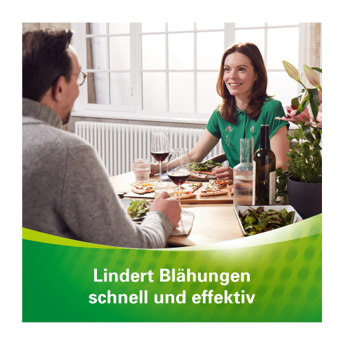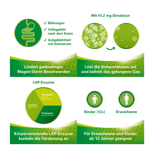 1 Kautablette enthält: 41,2 mg Simeticon und 50,0 mg Pankreaspulver vom Schwein (Lipase mind. 42 Ph.Eur. E./mg, Amylase mind. 36 Ph.Eur. E./mg, Protease mind. 2 Ph.Eur. E./mg.).