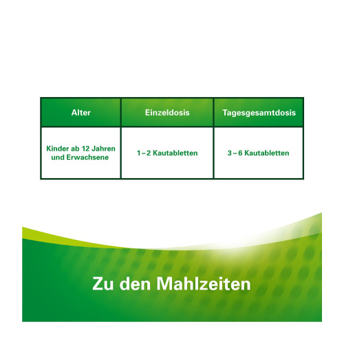 | Erwachsene und Kinder ab 12 Jahren | 1 – 2 Kautabletten | 3 – 6 Kautabletten |