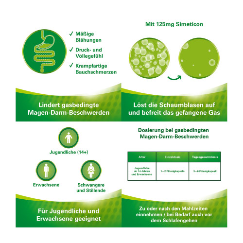 | Erwachsene, Jugendliche, Kinder ab 6 Jahren | 2 –3 Weichkapseln (entsprechend 250 mg bis 375 mg Simeticon) | 1 Weichkapsel (entsprechend 125 mg Simeticon) |