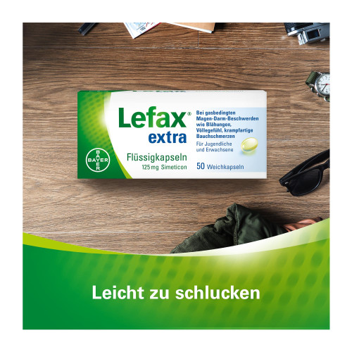 Lefax® extra Flüssigkapseln sind zu oder nach den Mahlzeiten, bei Bedarf auch vor dem Schlafengehen einzunehmen. Die Weichkapseln werden unzerkaut mit genügend Flüssigkeit (z.B. 1 Glas Wasser) geschluckt.
