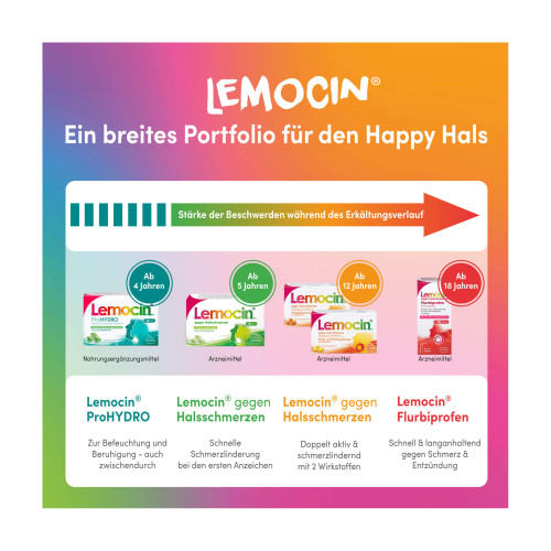 Lemocin gegen Halsschmerzen, Lutschtabletten. Wirkstoffe: Tyrothricin, Cetrimoniumbromid, Lidocain. Anwendungsgebiete: Zur temporären unterstützenden Behandlung bei schmerzhaften Entzündungen der Mund- und Rachenschleimhaut. Wenn Sie sich nach 2 Tagen nicht besser oder gar schlechter fühlen, wenden Sie sich an Ihren Arzt. Für Kinder ab 5 Jahren und Erwachsene. Warnhinweis:Enthält Sorbitol und Pfefferminzaroma.