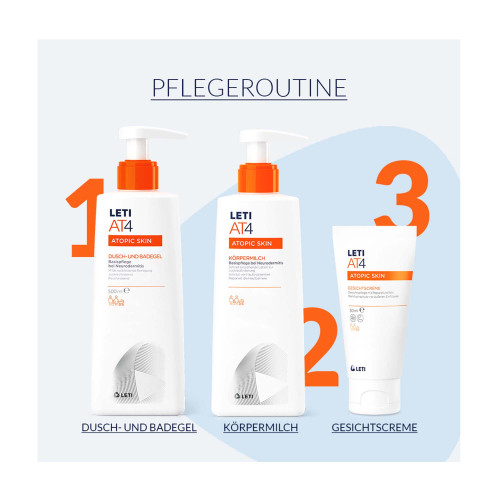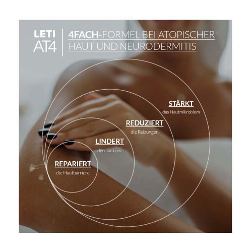 Die rückfettende LETI AT4 Körpermilch ist eine leichte und zugleich effektive Körperpflege zum Schutz trockener oder zu Neurodermitis neigender Haut. Sie repariert die Hautbarriere, spendet 24 h Feuchtigkeit, wirkt antioxidativ sowie antientzündlich und bringt das Mikrobiom der Haut ins Gleichgewicht. Entwickelt für Babys ab 3 Monaten, Kinder und Erwachsene.