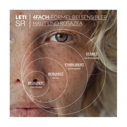 Das LETI SR Anti-Rötungen Fluid ist eine hochkonzentrierte Gesichtspflege für sensible Haut mit Gesichtsrötungen (Erythemen), Couperose und Rosazea Subtyp I. Seine innovative Rezeptur schützt und pflegt die Haut gleichermaßen. Das schnell einziehende Fluid wirkt beruhigend und mindert effektiv Rötungen. Zusätzlich wird Hautreizungen aktiv vorgebeugt, die häufig durch Luftverschmutzung entstehen. Die enthaltenen Wirkstoffe stärken die Hautstruktur und schützen vor Schäden, die durch blaues Licht verursacht werden können. Entwickelt für Erwachsene.