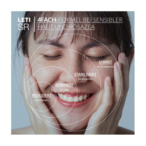 LETI SR Anti-Rötungen Gesichtsspray Aktiv ist der Ersthelfer bei irritierter Haut mit Gesichtsrötungen (Erythemen), Couperose und Rosazea Subtyp I. Es lindert das brennende Gefühl geröteter Gesichtshaut und reduziert die Rötungen aktiv. Der Teint wirkt dadurch ausgeglichen, natürlich und frisch. Die pflanzlichen Inhaltsstoffe des Sprays unterstützen die Hautbarriere und schützen die Haut vor weiteren Irritationen. Das feuchtigkeitsspendende, kühlende Spray senkt die Gesichtstemperatur und beugt so durch Hitzestress bedingte Hautalterung vor. Bei regelmäßiger Anwendung reduziert es die Häufigkeit von Flushing-Episoden (plötzlich auftretende Gesichtsröte). Seine hygienische Anwendbarkeit macht es zum praktischen Begleiter für unterwegs. Entwickelt für Erwachsene.