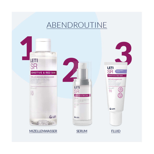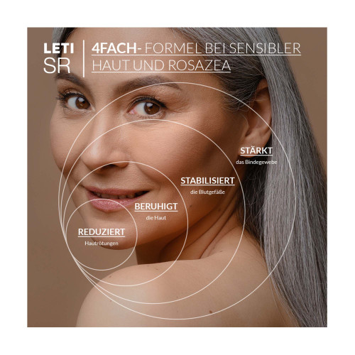 Das innovative LETI SR Anti-Rötungen Serum ist eine hochkonzentrierte Gesichtspflege für sensible Haut mit Gesichtsrötungen (Erythemen), Couperose und Rosazea Subtyp I. Es ist ideal zur Anwendung nach einer Gesichtslaserbehandlung der Gefäße geeignet. Die aktiven Inhaltsstoffe beschleunigen den Reparatur- und Regenerationsprozess der Haut und sorgen für einen doppelten Schutz. Sie stützen die Blutgefäße von innen sowie das umliegende Bindegewebe. Das Ergebnis ist ein überzeugender sofortiger Frischeeffekt, eine Reduktion der Rötungen und ein strafferes Hautbild. LETI SR Anti-Rötungen Serum spendet intensive Feuchtigkeit und trägt dazu bei, Allergierisiken zu minimieren. Entwickelt für Erwachsene.