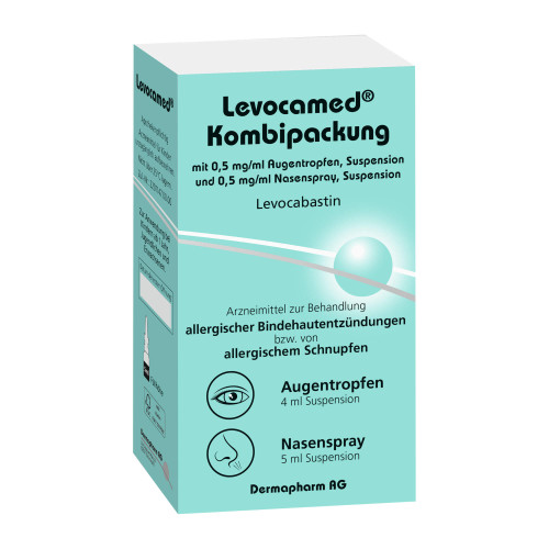 Levocamed® Kombipackung 0,5 mg/ml Augentropfen, Suspension, 0,5 mg/ml Nasenspray, Suspension. Wirkstoffe: Levocabastin. Anwendungsgebiete: Symptomatische Behandlung allergischer Konjunktivitis einschließlich Conjunctivitis vernalis bzw. symptomatische Behandlung allergischer Rhinitis bei Kindern ab 1 Jahr, Jugendlichen und Erwachsenen. Warnhinweise für die Augentropfen: Enthält Propylenglykol, Phosphate und Benzalkoniumchlorid. Verfärbung von Kontaktlinsen möglich. Warnhinweise für das Nasenspray: Enthält Propylenglykol und Benzalkoniumchlorid.