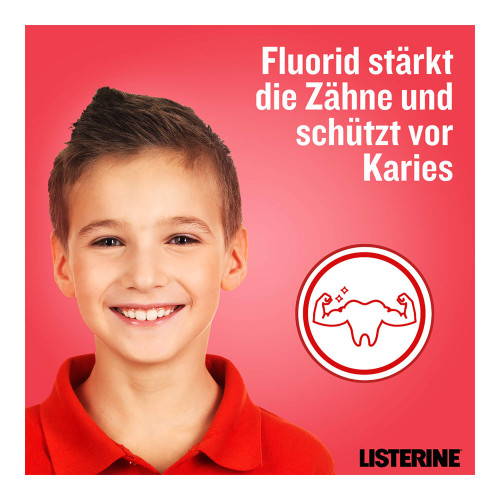 LISTERINE Smart Kidz Mild Berry ist eine Mundspülung für Kinder ab 6 Jahren, welche die Zähne Ihres Kindes vor Karies schützt, wenn sie 2x pro Tag nach dem Zähneputzen verwendet wird und macht da weiter, wo die Zahnbürste aufhört. Die Mundspülung für Kinder enthält Fluorid, das die Zähne stärkt und das Auftreten von Karies bis zu 40% mehr reduziert als Zähneputzen alleine. Zudem bekämpft die Mundspülung für Kinder schädliche Bakterien, eine Hauptursache für Plaque und Zahnfleischirritationen. Sie reinigt im gesamten Mundraum, erreicht die Zähne, das Zahnfleisch und die Zunge. Die Mundspülung zieht Speisereste an und färbt diese ein, so sieht ihr Kind diese beim Ausspucken im Waschbecken. Ohne Alkohol und ohne Zucker.