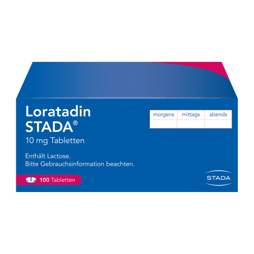 Loratadin Stada 10 mg Tabletten. Anwendungsgebiete: Zur Behandlung der Beschwerden bei allergisch bedingtem Schnupfen (z.B. Heuschnupfen) und bei Nesselsucht unbekannter Ursache (chronische idiopathische Urtikaria). Warnhinweis: Enthält Lactose.