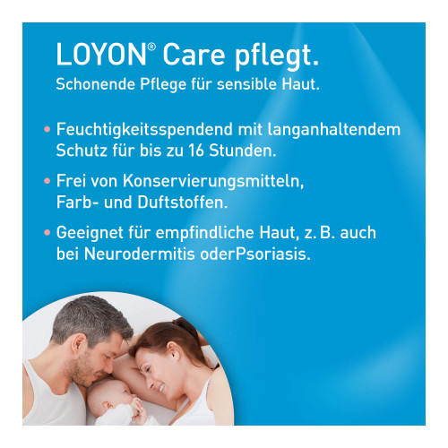 LOYON Care enthält Dexpanthenol, welches den Juckreiz lindert und die natürliche Regeneration der Haut unterstützt. Die spezielle Formulierung ist dermatologisch getestet und wurde entwickelt, um trockene, schuppige und juckende Haut mit Feuchtigkeit zu versorgen. Bei regelmäßiger Anwendung schützt LOYON Care die Haut zudem vor Feuchtigkeitsverlust und trägt zur Erhaltung des natürlichen Schutzmantels der Haut bei.