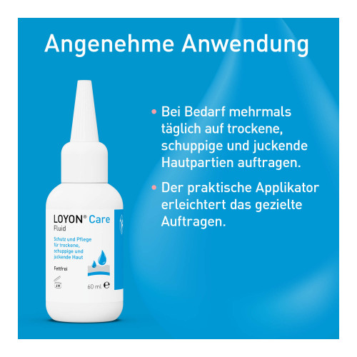 LOYON Care Fluid bei Bedarf mehrmals täglich auf trockene, schuppige und juckende Hautpartien auftragen. Der praktische Applikator erleichtert das gezielte Auftragen, insbesondere auf behaarten Hautpartien, wie z. B. der Kopfhaut.
