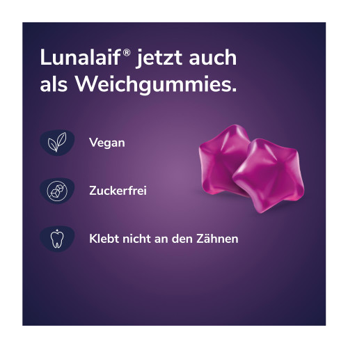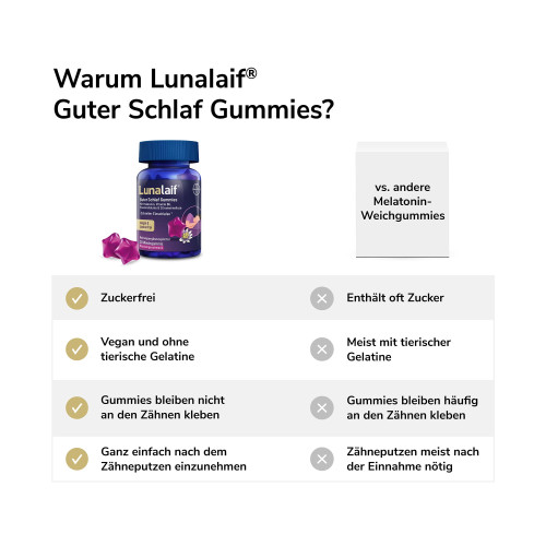 Wer ungern Tabletten einnimmt, aber nicht auf eine Einschlafhilfe verzichten möchte, für den sind die Lunalaif® Gummies eine gute Alternative. Im Gegensatz zu herkömmlichen Melatonin-Gummis sind die Lunalaif® Guter Schlaf Gummies zuckerfrei und kleben beim Einnehmen nicht an den Zähnen fest. Sie können daher problemlos auch nach dem Zähneputzen eingenommen werden. Die Verzehrempfehlung liegt bei einem Gummi pro Tag, die Einnahme sollte etwa 30–60 Minuten vor dem Zubettgehen erfolgen.