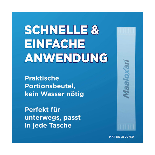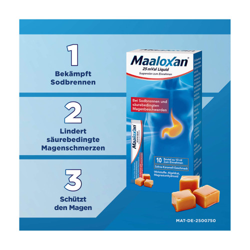 Maaloxan® 25 mVal Liquid. Wirkstoff: Algeldrat, Magnesiumhydroxid. Anwendungsgebiete: Zur symptomatischen Behandlung von Erkrankungen, bei denen die Magensäure gebunden werden soll: Sodbrennen u. säurebedingte Magenbeschwerden, Magen- od. Zwölffingerdarmgeschwüre (Ulcus ventriculi u. Ulcus duodeni). Warnhinweis: Nicht bei Kindern unter 12 Jahren anwenden. Beschwerden, die länger als 2 Wochen bestehen, klinisch abklären lassen. Die Einnahme anderer Arzneimittel sollte grundsätzlich mindestens 2 h vor oder nach Einnahme von Maaloxan Liquid erfolgen. Enthält Sorbitol, Pfefferminzöl.
