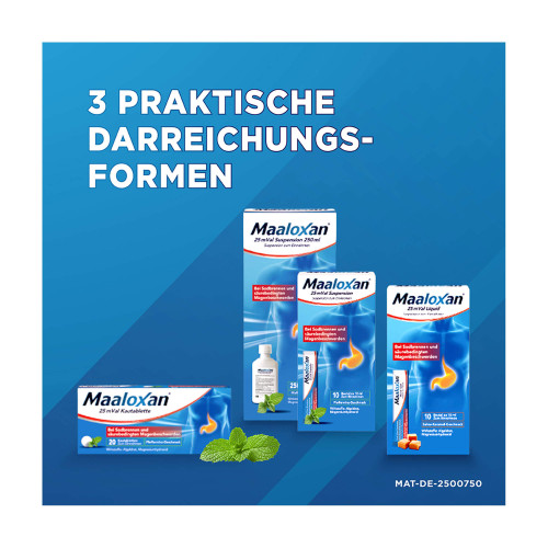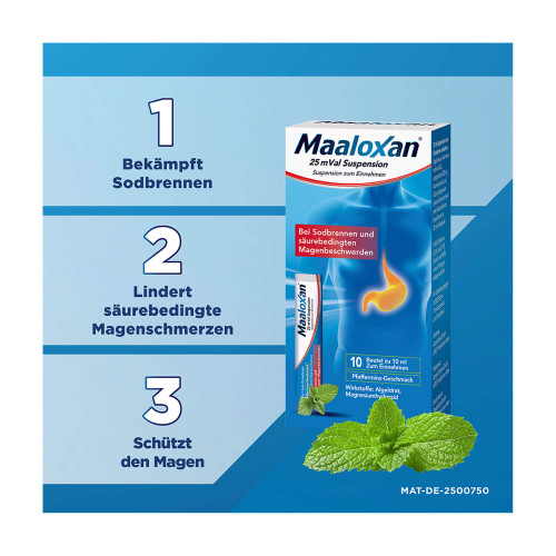 Maaloxan® 25 mVal Suspension / 25mVal Suspension 250 ml. Wirkstoffe: Algeldrat, Magnesiumhydroxid. Anwendungsgebiete: Zur symptomatischen Behandlung von Erkrankungen, bei denen die Magensäure gebunden werden soll: Sodbrennen und säurebedingte Magenbeschwerden, Magen- oder Zwölffingerdarmgeschwüre (Ulcus ventriculi und Ulcus duodeni). Warnhinweis: Nicht bei Kindern unter 12 Jahren anwenden. Beschwerden, die länger als 2 Wochen bestehen, klinisch abklären lassen. -25 mVal Suspension enthält Sorbitol, Pfefferminzöl, Methyl-4-hydroxybenzoat und Propyl-4-hydroxybenzoat (Parabene). Die Einnahme anderer Arzneimittel sollte grundsätzlich mindestens 2 h vor oder nach Einnahme von Maaloxan Suspension erfolgen.