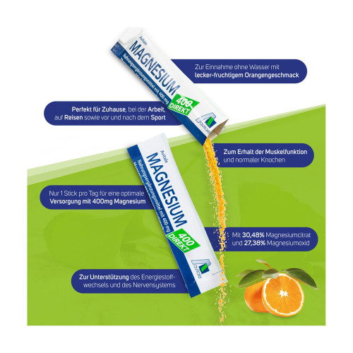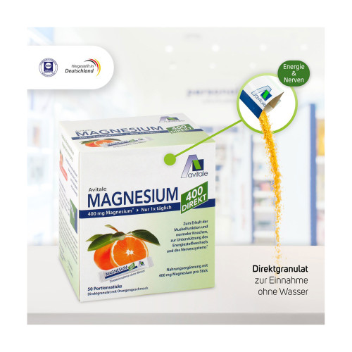 Avitale Magnesium 400 Direkt ist ideal, um den Magnesiumspiegel täglich zu sichern. Das leckere Granulat mit fruchtigem Orangengeschmack kann ohne Flüssigkeit sofort eingenommen werden. Nur ein Stick täglich versorgt den Körper mit 107% der Referenzmenge an Magnesium.