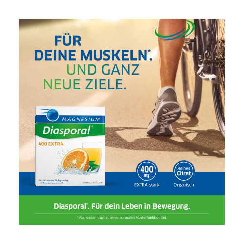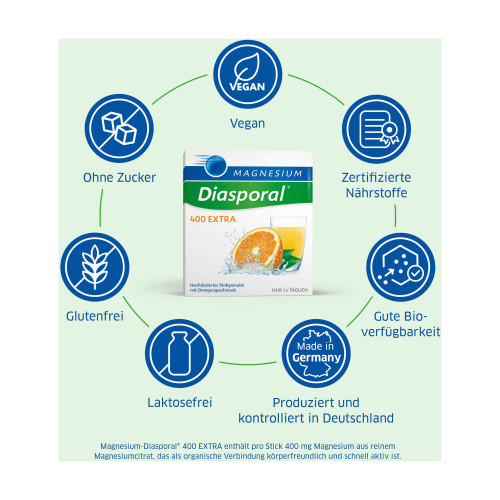 Magnesium-Diasporal® 400 EXTRA enthält reines Magnesiumcitrat, das als organische Verbindung körperfreundlich und schnell aktiv ist. Das Trinkgranulat schmeckt extra fruchtig und versorgt den Körper zusätzlich mit Flüssigkeit. Für den erhöhten Magnesiumbedarf.