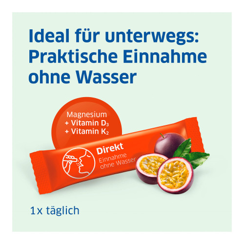 Magnesium unterstützt eine normale Muskelfunktion. Vitamin D3 und K2 tragen zur Erhaltung normaler Knochen bei. Vitamin D3 leistet einen Beitrag zu einer normalen Funktion des Immunsystems.