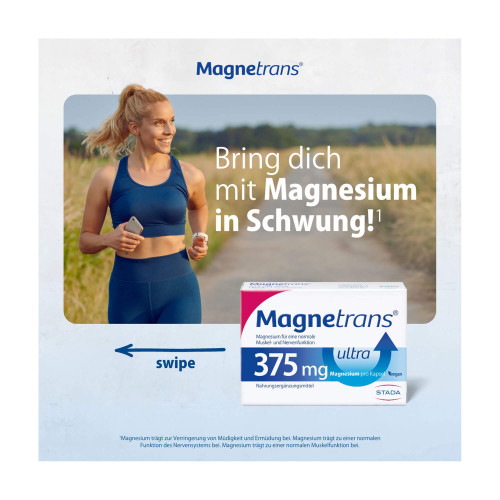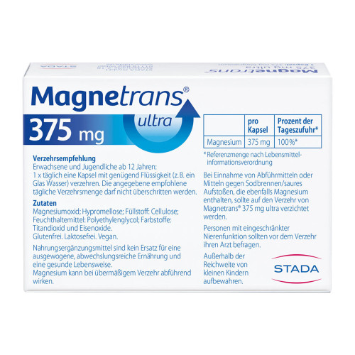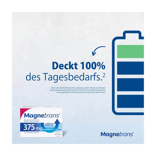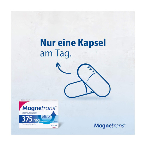 Magnetrans® 375 mg ultra kann zu einer zusätzlichen Versorgung mit Magnesium beitragen. Magnetrans® ultra 375 mg Kapseln können Ihnen helfen, mit nur einer Kapsel täglich 100 % des täglichen Magnesiumbedarfs zu decken und können einen Beitrag dazu zu leisten, die körpereigenen Magnesiumdepots aufzufüllen.